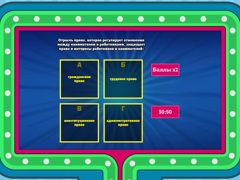 1) Своевременный приход на работу, соблюдение установленной продолжительности рабочего дня, рациональное использование времени для наиболее производительного плодотворного труда, точное исполнение распоряжений администрации: a) рабочее время b) трудовая дисциплина c) трудовой договор d) испытательный срок e) трудовая функция 2) Выберите условия, при которых работник может по своей инициативе разорвать контракт с нанимателем: a) болезнь b) ликвидация организации c) несоответствие занимаемой должности 3) Отрасль права, которая регулирует отношения между нанимателем и работниками, защищает права и интересы работников и нанимателей: a) административное право b) конституционное право c) гражданское право d) трудовое право 4) Условие, при котором работник может по своей инициативе разорвать контракт с нанимателем и законно покинуть место своей работы: a) работник обязан предупредить нанимателя о своем решении в письменной форме за месяц до увольнения b) прогул c) нарушение требований по охране труда d) инвалидность e) недостаточная квалификация 5) Сколько дней минимум должен находится работник в отпуске a) 30 b) 24 c) 21 d) 45 6) Верно ли, что фамилия ребенку обычно дается по фамилии: а) отца и б) матери a) Верно А b) Верно Б c) Верно А и Б d) Все неверено 7) ЗАключение брака возможно по достижении a) 14 b) 15 c) 16 d) 17 e) 18 8) Контракт заключается с работником на срок не менее 1 года и не более .....лет a) 4 b) 5 c) 3 d) 6 9) В трудовом договоре не содержится следующие условие: a) данные о работнике b) место работы c) трудовая функция d) вмешательство нанимателя в личную жизнь работника 10) В трудовом договоре может предусматриваться испытательный срок- он устанавливается с целью проверки соответствия работника поручаемой ему работе на срок не более чем a) 1 месяц b) 3 месяца c) 6 месяцев d) 1 год e) 2 года 11) 16-летний Максим устроился на подработку официантом в местное кафе. Администрация попросила выйти на работу 3 июля - День независимости. Правомерно ли это  a) нет b) да 12) 20-летнюю Иру уволили с работы по причине неявки на работу в течение более 4 месяцев подряд вследствие временной нетрудоспособности. Правомерно ли это a) да b) нет