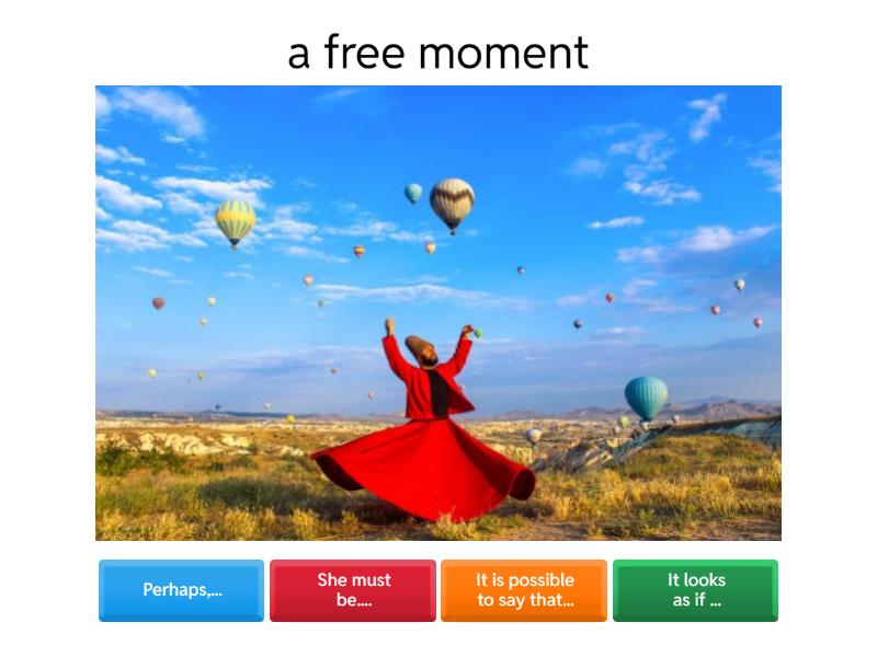 1) a free moment a) Perhaps,... b) She must be.... c) It is possible to say that... d) It looks as if ... 2) group skydiving a) They may/might/could be + verb-ing b) Possibly, the woman is... + verb-ing c) I get the impression that... d) It could be said that… 3) a long-lost friend a) They may/might/could be + verb-ing... b) I’m under the impression that… c) Obviously,... d) It appears to me that... 4) a traffic controller a) She may/might/could be + verb-ing... b) Ostensibly,… c) I get the impression that... d) It is possible to say that… 5) an embarrassing moment a) They could/may/might be + verb-ing... b) Perhaps, they are ... + verb-ing c) I get the impression that... d) They must have +verb-ed 6) working on the plane a) She may/might/could be + verb-ing... b) She could have + verb-ed c) I can see that… d) It appears to me that... 7) a business encounter a) They could/might be + verb-ing... b) I can see that... c) I have the feeling that... d) They must be + verb+ing... 8) an extreme activity a) He might be + verb-ing... b) Ostensibly,… c) I have the impression that... d) It looks like...