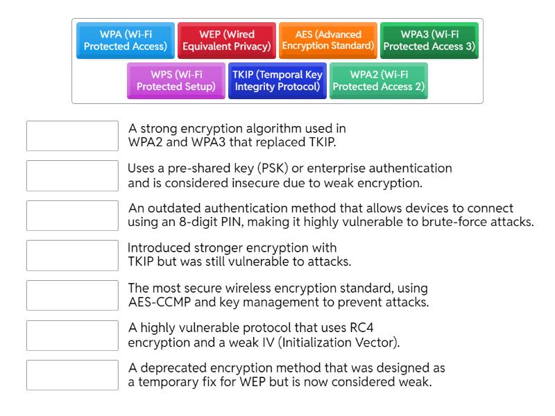 WEP (Wired Equivalent Privacy) - A highly vulnerable protocol that uses RC4 encryption and a weak IV (Initialization Vector)., WPA (Wi-Fi Protected Access) - Introduced stronger encryption with TKIP but was still vulnerable to attacks., WPA2 (Wi-Fi Protected Access 2) - Uses a pre-shared key (PSK) or enterprise authentication and is considered insecure due to weak encryption., WPA3 (Wi-Fi Protected Access 3) - The most secure wireless encryption standard, using AES-CCMP and key management to prevent attacks., WPS (Wi-Fi Protected Setup) - An outdated authentication method that allows devices to connect using an 8-digit PIN, making it highly vulnerable to brute-force attacks., TKIP (Temporal Key Integrity Protocol) - A deprecated encryption method that was designed as a temporary fix for WEP but is now considered weak., AES (Advanced Encryption Standard) - A strong encryption algorithm used in WPA2 and WPA3 that replaced TKIP.,