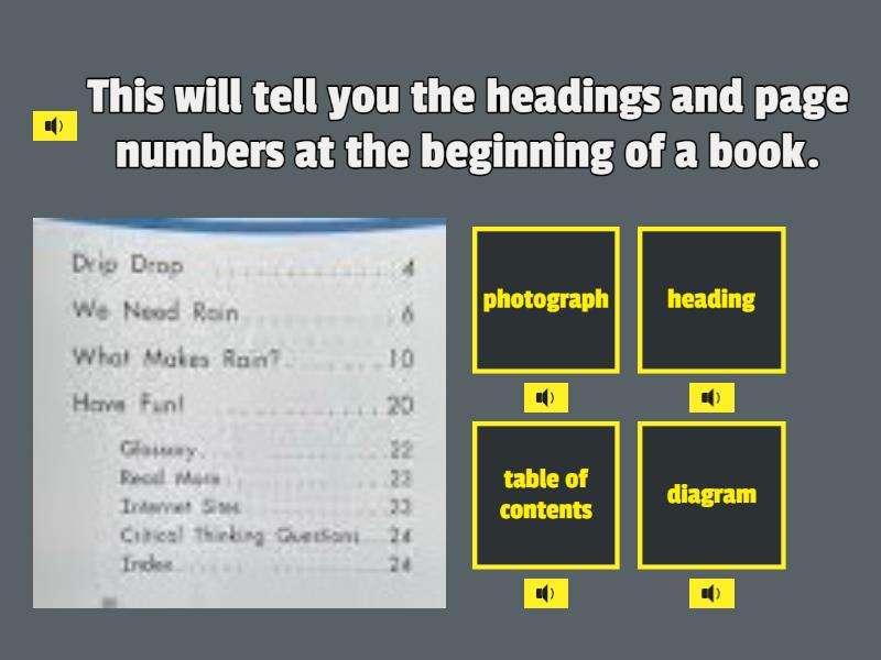 1) This will tell you the headings and page numbers at the beginning of a book. a) photograph b) heading c) table of contents d) diagram 2) This explains a photograph. a) caption b) subheading c) glossary d) illustration 3) This labels the different parts of a picture. a) bold word b) diagram c) chart d) heading 4) This shows the location of something. a) map b) text box c) illustration d) title 5) This is a picture taken with a camera. a) subheading b) glossary c) photograph d) illustration 6) This tells me what a paragraph will be about. a) title b) subheading c) label d) table of contents 7) This tells what a chapter will be about. a) chart b) heading c) map d) glossary 8) This is at the end of the book and tells the definitions of bold words. a) glossary b) bold word c) caption d) text box 9) This gives more details about something in a graph. a) photograph b) chart c) label d) table of contents 10) This names a part of a picture. a) subheading b) label c) caption d) glossary 11) This tells the name of the book or article. a) title b) caption c) label d) glossary 12) This a picture that is drawn. a) chart b) map c) illustration d) diagram 13) This has extra information about the topic in a box. Sometimes it is a fun fact. a) bold word b) heading c) text box d) caption 14) This is an important word in the paragraph. a) table of contents b) subheading c) illustration d) bold word