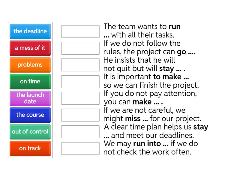 the course - He insists that he will not quit but will stay ... ., on track - A clear time plan helps us stay ... and meet our deadlines., problems - We may run into ... if we do not check the work often., on time - The team wants to run ... with all their tasks., the launch date - If we are not careful, we might miss ... for our project., out of control - If we do not follow the rules, the project can go ...., the deadline - It is important to make ... so we can finish the project., a mess of it - If you do not pay attention, you can make ... .,