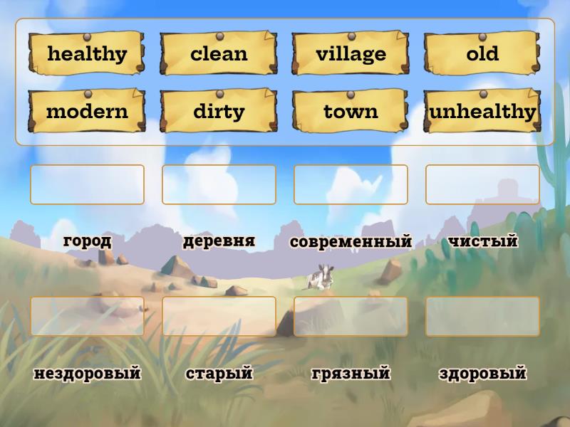 old - старый, modern - современный, healthy - здоровый, unhealthy - нездоровый, dirty - грязный, clean - чистый, town - город, village - деревня,