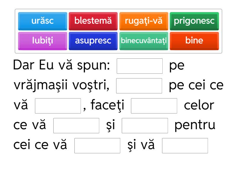 Dar Eu vă spun: ____ pe vrăjmaşii voştri, ____ pe cei ce vă ____, faceţi ____ celor ce vă ____ şi ____ pentru cei ce vă ____ şi vă ____