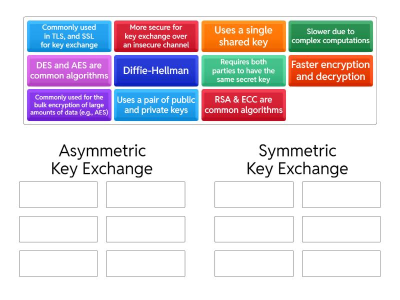 Asymmetric Key Exchange: Uses a pair of public and private keys, Slower due to complex computations, More secure for key exchange over an insecure channel, Commonly used in TLS, and SSL for key exchange, RSA & ECC are common algorithms, Symmetric Key Exchange: DES and AES are common algorithms, Commonly used for the bulk encryption of large amounts of data (e.g., AES), Requires both parties to have the same secret key, Faster encryption and decryption, Uses a single shared key, Diffie-Hellman,