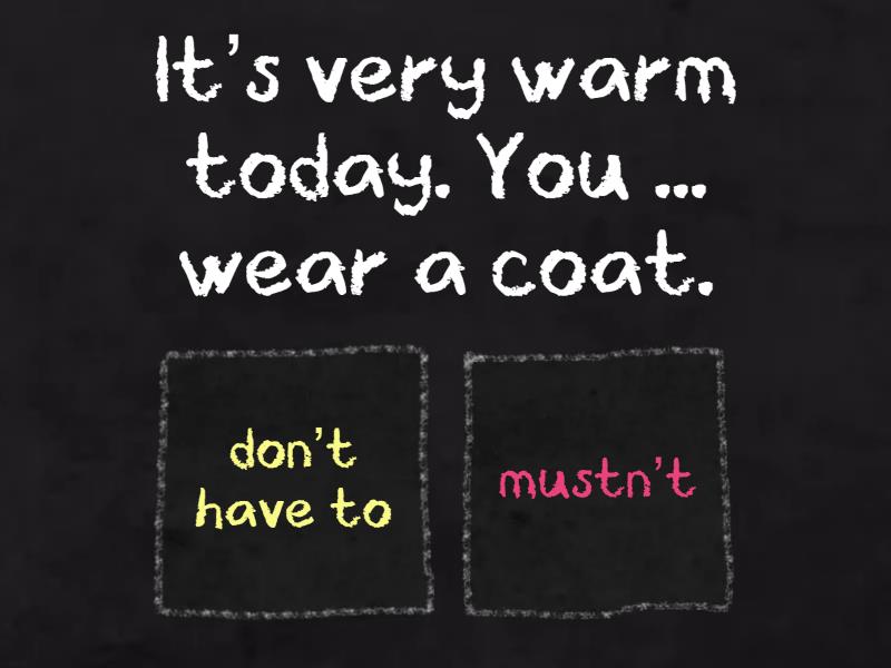 1) It’s very warm today. You ... wear a coat. a) don’t have to b) mustn’t 2) I ... get up early tomorrow because it’s Saturday. a) need to b) don’t have to 3) Do you ... cook your own food? a) must b) have to 4) I’ve got a test tomorrow. I ... go to bed early tonight. a) must b) don’t have to 5) Karen speaks French really well, so she ... practise much. a) doesn’t need to b) mustn’t 6) You … buy a ticket – the buses are free today! a) have to b) mustn’t c) don’t need to 7) Hurry up! We … be late for our lesson a) don’t need to   b) mustn’t c) have to 8) Do they … to clean their classrooms? a) must b) have to c) need 9) How long do you … practise the guitar? a) have to b) need c) must 10) Pay attention! You … listen more carefully! a) need b) mustn’t c) must