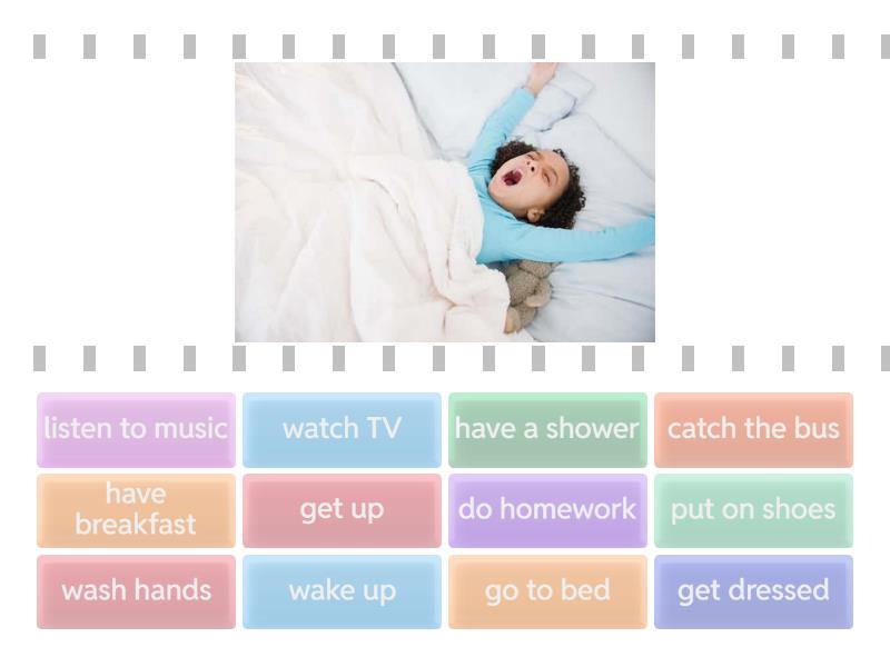 wake up, get up, have breakfast, have a shower, listen to music, get dressed, put on shoes, catch the bus, do homework, watch TV, wash hands, go to bed,