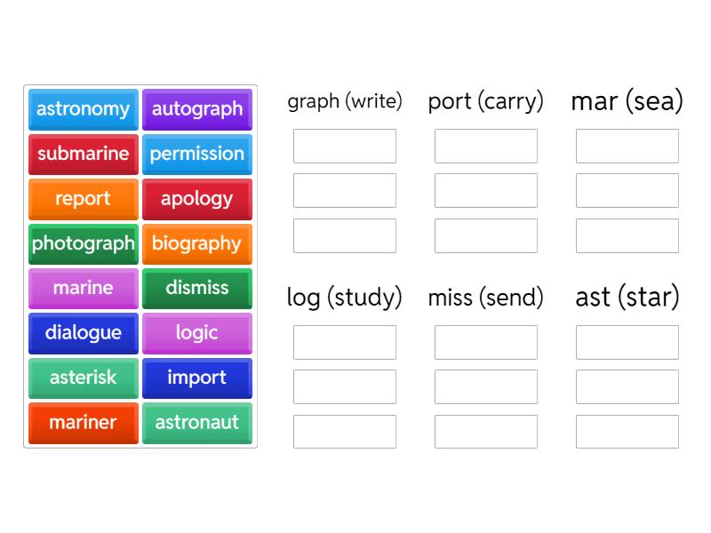 graph (write): autograph, photograph, biography, port (carry): import, report, mar (sea): mariner, marine, submarine, log (study): apology, dialogue, logic, miss (send): dismiss, permission, ast (star): astronomy, astronaut, asterisk,