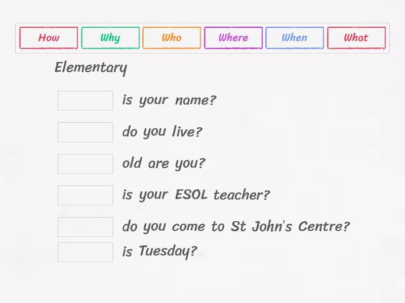 Elementary ____ is your name? ____ do you live? ____ old are you? ____ is your ESOL teacher? ____ do you come to St John’s Centre? ____ is Tuesday? Beginner ____ is your favorite hobby? ____ do you like shopping for food? ____ many fruits can you eat a day? ____ is better cook, you or your mother? ____ is it cold in January? ____ does spring begin?
