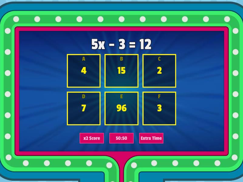 1) 5x - 3 = 12 a) 4 b) 15 c) 2 d) 7 e) 96 f) 3 2) 27 + 14b = 111 a) 5 b) 17 c) 6 d) 9 3) 17x - 14 = 20 a) 4 b) 2 c) 0 d) 10 4) 5e - 20 = 2e + 10 a) 9 b) 12 c) 10 d) 14 5) 4(x+5) - 6 = 2x + 18 a) 6 b) 8 c) 13 d) 9