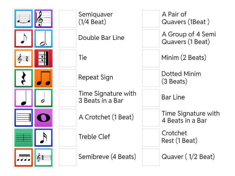 A Crotchet (1 Beat), Dotted Minim (3 Beats), A Pair of Quavers (1Beat ), Crotchet Rest (1 Beat), Minim (2 Beats), A Group of 4 Semi Quavers  (1 Beat), Time Signature with 4 Beats in a Bar, Quaver ( 1/2 Beat), Semibreve (4 Beats), Bar Line, Time Signature with 3 Beats in a Bar , Semiquaver (1/4 Beat), Double Bar Line, Repeat Sign, Treble Clef, Tie,