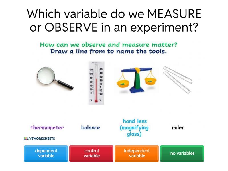 1) Which variable do we MEASURE or OBSERVE in an experiment? a) dependent variable b) control variable c) independent variable d) no variables 2) Which variable is the one you would CHANGE in an investigation? a) independent variable b) control variable c) dependent variable d) no variable 3) Which variable do we need to KEEP THE SAME in a Science experiment? a) the dependent variable b) no variable c) the control variables d) the independent variable 4) What is the independent (change) variable in the dancing raisins experiment? a) the amount of water b) the amount of raisins c) the type of liquid d) size of glass 5) What did the student measure in the dancing raisins experiment? a) what type of dancing the raisins were doing b) the amount of dancing raisins c) how many bubbles there were d) how cold the water was 6) Why did the raisins fall back down in the carbonated soda? a) bubbles popped and raisins became heavier b) the bottom part of the container attracted the raisins c) the raisins could dance d) the raisins like dancing 7) Fill in the correct dependent variable for this experiment question. How does changing the type of liquid affect the____________? a) type of liquid b) amount of rising raisins c) amount of liquid d) amount of bubbles 8) Fill in the correct independent variable for this experiment question. How does changing the ________________ affect the rising raisins? a) type of glass b) type of raisin c) type of liquid d) amount of bubbles 9) What was kept the SAME in the dancing raisins experiment? a) the type of liquid b) the amount of liquid c) the size of the bubbles d) the type of dancing 10) What made the raisins rise to the surface? a) the bubbles attached to the raisins making them lighter b) the raisins jumped up c) the raisins had lots of energy d) the raisins like to dance