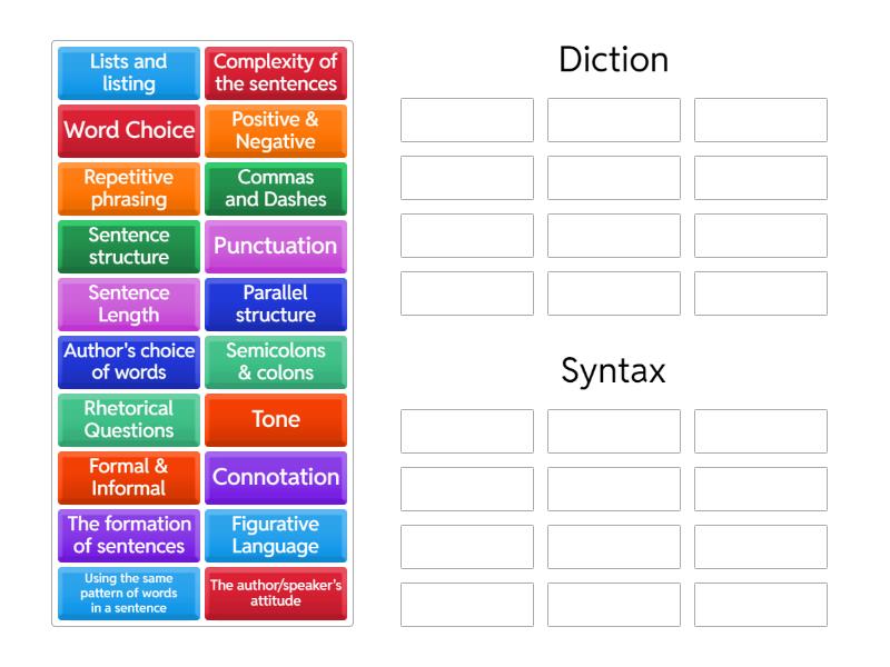 Diction: Word Choice, Connotation, The author/speaker's attitude, Tone, Author's choice of words, Figurative Language, Formal & Informal, Positive & Negative, Syntax: Sentence structure, Complexity of the sentences, Using the same pattern of words in a sentence, Repetitive phrasing, Lists and listing, Parallel structure, Commas and Dashes, The formation of sentences, Semicolons & colons, Punctuation, Rhetorical Questions, Sentence Length,