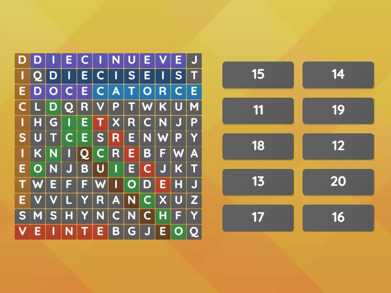 once - 11, doce - 12, trece - 13, catorce - 14, quince - 15, dieciseis - 16, diecisiete - 17, dieciocho - 18, diecinueve - 19, veinte - 20,