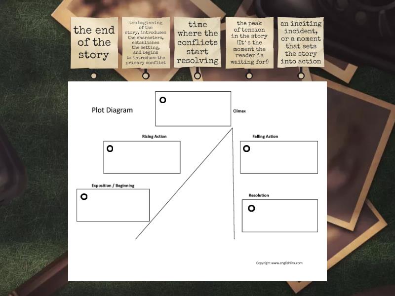 the beginning of the story, introduces the characters, establishes the setting, and begins to introduce the primary conflict, an inciting incident, or a moment that sets the story into action, the peak of tension in the story (It’s the moment the reader is waiting for!), time where the conflicts start resolving, the end of the story.