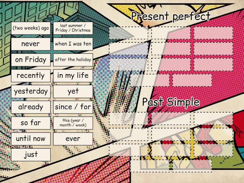 Present perfect: just, this (year / month / week), since / for, already, recently, until now, ever, in my life, never, so far, yet, Past Simple: last summer / Friday / Christmas, (two weeks) ago, on Friday, yesterday, when I was ten, after the holiday,