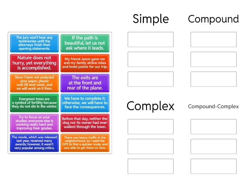 Simple: My friend Jason gave me and my family airline miles and hotel points for our trip., The exits are at the front and rear of the plane., Before that day, neither the dog nor its owner had ever walked through the town., Compound: Nature does not hurry, yet everything is accomplished., We have to complete it; otherwise, we will have to face the consequences., Try to focus on your studies; everyone else is working really hard and improving their grades., Complex: The jury won't hear any testimonies until the attorneys finish their opening statements., Evergreen trees are a symbol of fertility because they do not die in the winter., If the path is beautiful, let us not ask where it leads., Compound-Complex: There was heavy traffic in the neighborhood, so I used the GPS to find a quicker route, and was able to get there on time., The movie, which was released last year, received many awards; however, it wasn't very popular among critics., Since I have not analyzed your paper, please wait till next week, and we will work on it then.,