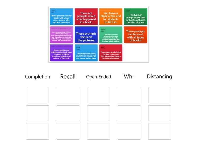 Completion: You leave a blank at the end for students to fill it in., Completion prompts provide children with information about the structure of language that is critical to later reading., Recall: These are prompts about what happened in a book., These prompts can be used with all types of books!, These prompts can be used not only at the end of a book but also at the beginning if a child has read the text before., Open-Ended: This type of prompt works best for books with rich, detailed pictures, This prompt works helps children to increase their expressive fluency and attend to detail, Wh-: These prompts usually begin with what, when, where, why and how questions., These prompts focus on the pictures., Distancing: These prompts ask children to relate pictures or words to things they have experienced outside of the book., These prompts help children with the following: form a bridge between books and the real world, help with verbal fluency, conversational abilities, and narrative skills.,