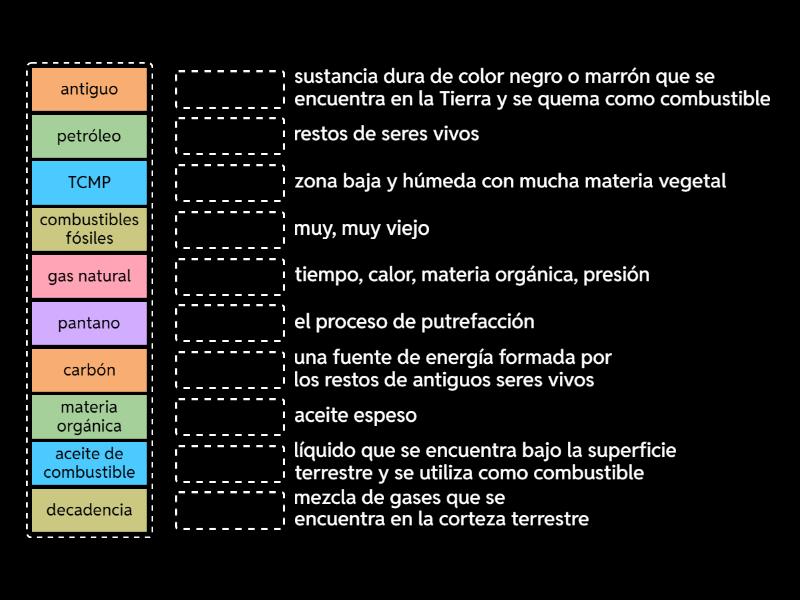 combustibles fósiles - una fuente de energía formada por los restos de antiguos seres vivos, carbón - sustancia dura de color negro o marrón que se encuentra en la Tierra y se quema como combustible, decadencia - el proceso de putrefacción, gas natural - mezcla de gases que se encuentra en la corteza terrestre, petróleo - líquido que se encuentra bajo la superficie terrestre y se utiliza como combustible, aceite de combustible - aceite espeso, antiguo - muy, muy viejo, pantano - zona baja y húmeda con mucha materia vegetal, materia orgánica - restos de seres vivos, TCMP - tiempo, calor, materia orgánica, presión,