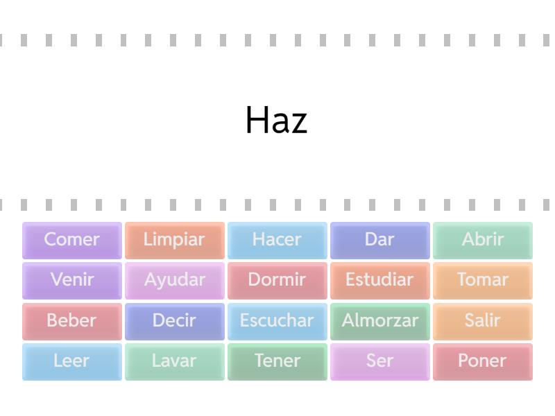 Hacer - Haz, Poner - Pon, Salir - Sal, Tener - Ten, Ser - Se, Decir - Di, Abrir - Abre, Estudiar - Estudia, Venir - Ve, Escuchar - Escucha, Dormir - Duerme, Tomar - Toma, Almorzar - Almuerza, Ayudar - Ayuda, Dar - Da, Lavar - Lava, Limpiar - Limpia, Comer - Come, Leer - Lee, Beber - Bebe,