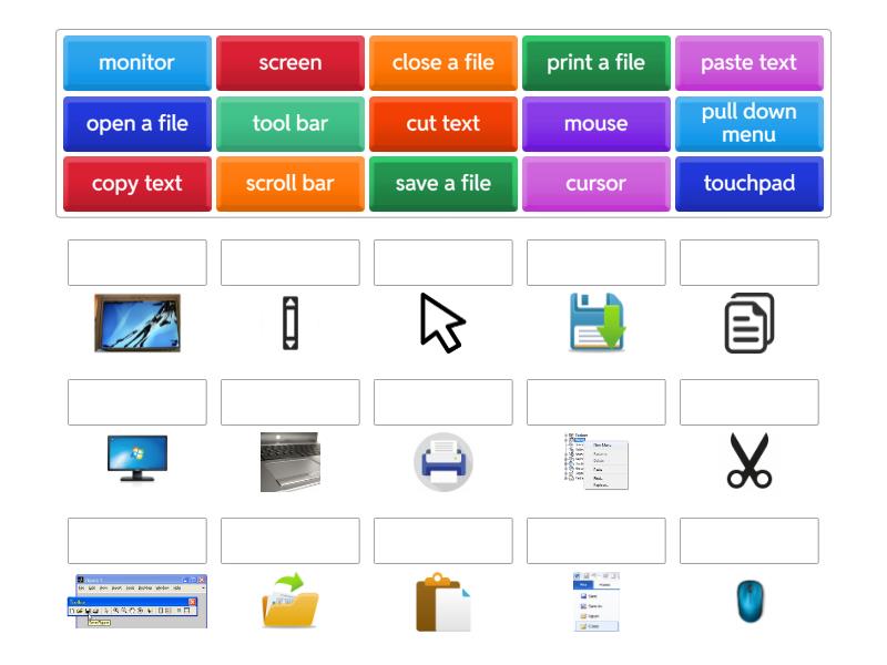 mouse, monitor, screen, touchpad, pull down menu, tool bar, scroll bar, cursor, open a file, save a file, print a file, close a file, cut text, copy text, paste text,