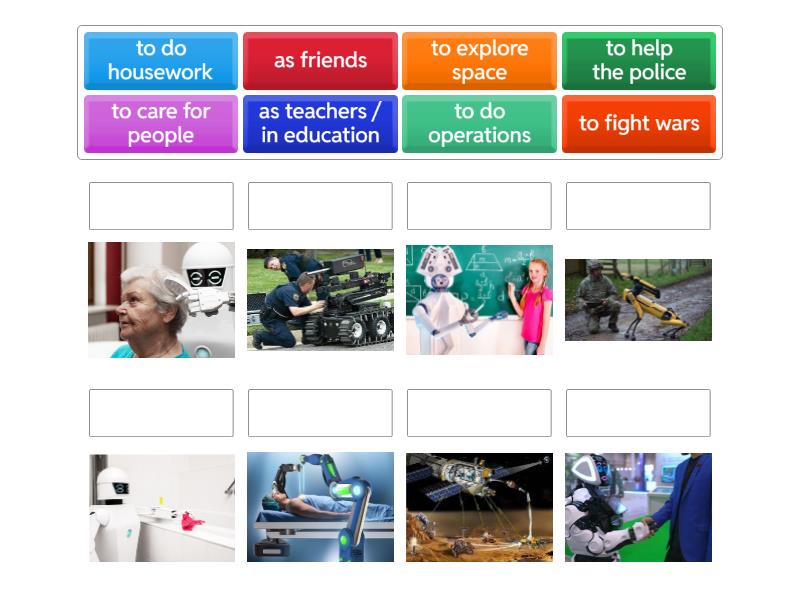 to do housework, to explore space, as friends, as teachers / in education , to do operations, to care for people, to help the police, to fight wars,