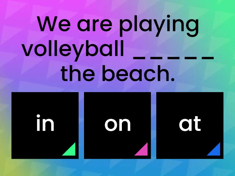 1) We are playing volleyball _____ the beach. a) in b) on c) at 2) Chloe's shop is _____ Arlington Avenue. a) in b) on c) at 3) She is sitting _____ the teacher's chair. a) in b) on c) at 4) He prefers to work _____ a farm. a) in b) on c) at 5) They live _____ London. a) in b) on c) at 6) They always do their homework _____ school. a) in b) on c) at 7) He puts the sugar _____ the sugar bowl. a) in b) on c) at 8) We are _____ Madrid Airport. a) in b) on c) at 9) We are _____ Madrid. a) in b) on c) at 10) I don't like that picture _____ wall. a) in b) on c) at 11) My best friend and I are _____ the concert now. a) in b) on c) at 12) Would you like to work _____ a cruise? a) in b) on c) at 13) She runs _____ the park every day. a) in b) on c) at 14) They are swimming _____ the river. a) in b) on c) at 15) I work _____ Polanco. a) in b) on c) at 16) I'm _____ the second floor. a) in b) on c) at 17) We are _____ Wendy and Michael's wedding. a) in b) on c) at 18) Where are you? I'm _____ 49 River Street. a) in b) on c) at 19) There was a big bear _____ the forest. a) in b) on c) at 20) I'm having dinner _____ home. a) in b) on c) at 21) A: I can't see you! B: I'm ____ Stone Street. a) in b) on c) at 22) I'm watching TV ____ my bedroom. a) in b) on c) at 23) Your dress is ____ the closet. a) in b) on c) at 24) I'm with Michael ____ the bus station. a) in b) on c) at 25) The meeting is ____ Zoom. a) in b) on c) at