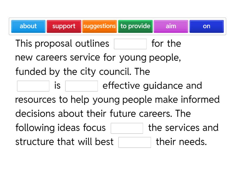 This proposal outlines ____ for the new careers service for young people, funded by the city council. The ____ is ____ effective guidance and resources to help young people make informed decisions about their future careers. The following ideas focus ____ the services and structure that will best ____ their needs. ____ that many young people, ____ students, are busy during traditional office hours, it is ____ that the careers service is accessible during the evening. The ____ opening hours of 11.30 am to 8.00 pm, with the possibility of extended hours, would allow students to visit the office after school or university. These hours will ensure that the service is available when it is most convenient for those seeking ____ or information. The service ____ provide comprehensive information ____ higher education options, ____ university programs, vocational training, and apprenticeships. This could be done through leaflets, online resources, and one-on-one consultations. ____, many young people need part-time or temporary work to support their studies or gain experience. The careers service should also provide a platform for students to find relevant work opportunities. This ____ include partnerships with local businesses or job placement schemes. A dedicated job notice board should be maintained, where local businesses and companies can advertise their vacancies. This would ____ young people easy access to current job opportunities in various industries. ____ that, a digital version of the notice board ____ be created, accessible through the service's website, ____ students ____ view listings remotely. In conclusion, the proposed careers service ____ provide a valuable resource for young people, ____ them in their academic and professional journeys. ____ ____ flexible hours, comprehensive information, and easy access to job opportunities, the service would contribute significantly ____ their future success.