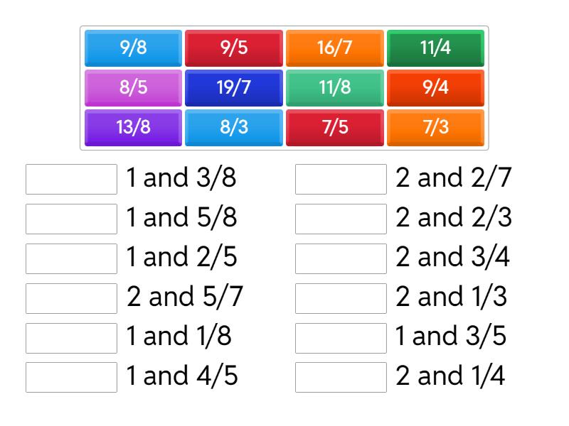 7/5 - 1 and 2/5, 9/8 - 1 and 1/8, 8/5 - 1 and 3/5, 11/8 - 1 and 3/8, 7/3 - 2 and 1/3, 8/3 - 2 and 2/3, 9/4 - 2 and 1/4, 11/4 - 2 and 3/4, 9/5 - 1 and 4/5, 13/8 - 1 and 5/8, 16/7 - 2 and 2/7, 19/7 - 2 and 5/7,