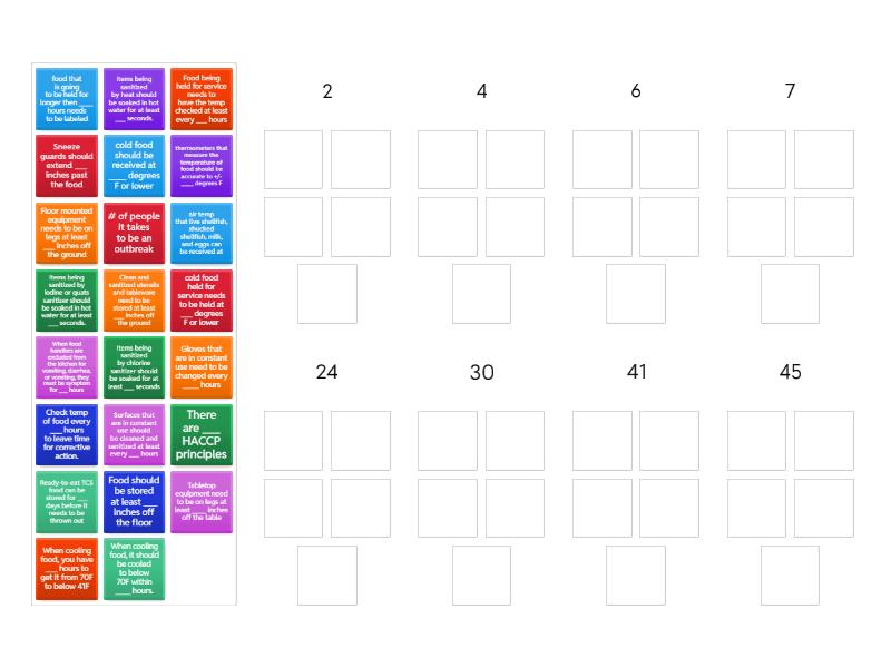 2: # of people it takes to be an outbreak, thermometers that measure the temperature of food should be accurate to +/- ____ degrees F, When cooling food, it should be cooled to below 70F within ____ hours., Check temp of food every ___ hours to leave time for corrective action., 4: Food being held for service needs to have the temp checked at least every ___ hours, Surfaces that are in constant use should be cleaned and sanitized at least every ___ hours, Tabletop equipment need to be on legs at least ____ inches off the table, Gloves that are in constant use need to be changed every ____ hours, When cooling food, you have ___ hours to get it from 70F to below 41F, 6: Food should be stored at least ___ inches off the floor, Clean and sanitized utensils and tableware need to be stored at least ___ inches off the ground, Floor mounted equipment needs to be on legs at least ___ inches off the ground, 7: Ready-to-eat TCS food can be stored for ___ days before it needs to be thrown out, Sneeze guards should extend ___ inches past the food, There are ___ HACCP principles, Items being sanitized by chlorine sanitizer should be soaked for at least ___ seconds, 24: food that is going to be held for longer then ____ hours needs to be labeled, When food handlers are excluded from the kitchen for vomiting, diarrhea, or vomiting, they must be symptom for ___ hours, 30: Items being sanitized by heat should be soaked in hot water for at least ___ seconds., Items being sanitized by iodine or quats sanitizer should be soaked in hot water for at least ___ seconds., 41: cold food should be received at ____ degrees F or lower, cold food held for service needs to be held at ___ degrees F or lower, 45: air temp that live shellfish, shucked shellfish, milk, and eggs can be received at,