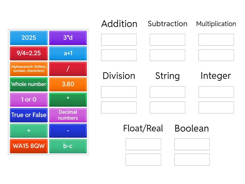 Addition: +, a+1, Subtraction: -, b-c, Multiplication: *, 3*d, Division: /, 9/4=2.25, String: Alphanumeric (letters, number, characters), WA15 8QW, Integer: Whole number, 2025, Float/Real: Decimal numbers, 3.80, Boolean: True or False, 1 or 0,