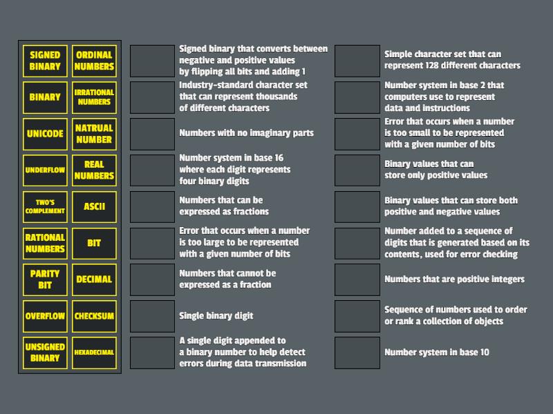 ASCII - Simple character set that can represent 128 different characters, BINARY - Number system in base 2 that computers use to represent data and instructions, CHECKSUM - Number added to a sequence of digits that is generated based on its contents, used for error checking, DECIMAL - Number system in base 10, HEXADECIMAL - Number system in base 16 where each digit represents four binary digits, IRRATIONAL NUMBERS - Numbers that cannot be expressed as a fraction, NATRUAL NUMBER - Numbers that are positive integers, ORDINAL NUMBERS - Sequence of numbers used to order or rank a collection of objects, OVERFLOW - Error that occurs when a number is too large to be represented with a given number of bits, PARITY BIT - A single digit appended to a binary number to help detect errors during data transmission, RATIONAL NUMBERS - Numbers that can be expressed as fractions, REAL NUMBERS - Numbers with no imaginary parts, SIGNED BINARY - Binary values that can store both positive and negative values, TWO'S COMPLEMENT - Signed binary that converts between negative and positive values by flipping all bits and adding 1, UNDERFLOW - Error that occurs when a number is too small to be represented with a given number of bits, UNICODE - Industry-standard character set that can represent thousands of different characters, UNSIGNED BINARY - Binary values that can store only positive values, BIT - Single binary digit,