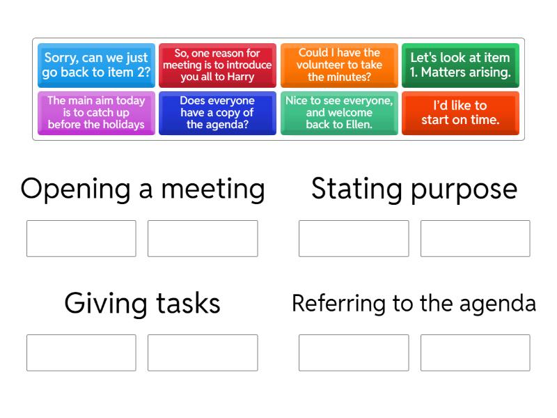 Opening a meeting: I’d like to start on time., Nice to see everyone, and welcome back to Ellen., Stating purpose: The main aim today is to catch up before the holidays, So, one reason for meeting is to introduce you all to Harry, Giving tasks: Could I have the volunteer to take the minutes?, Let's look at item 1. Matters arising., Referring to the agenda: Sorry, can we just go back to item 2?, Does everyone have a copy of the agenda?,