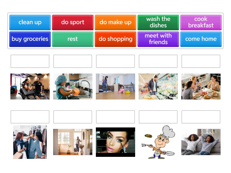 cook breakfast, do sport, come home, wash the dishes, clean up, buy groceries, do shopping, meet with friends, rest, do make up,
