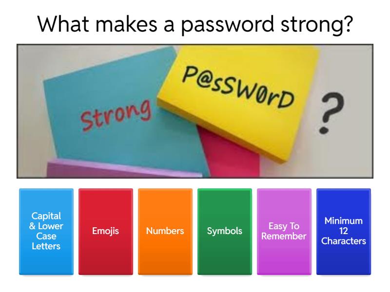 1) What makes a password strong? a) Capital & Lower Case Letters b) Emojis c) Numbers d) Symbols e) Easy To Remember f) Minimum 12 Characters  2) How do you keep your password secure? a) Don't Tell Anyone Your Password b) Write It Down c) Don't Write It Down d) Make Your Password Your Name 3) How do you know a website is safe? a) http b) https c) Doesn't Have Spelling Mistakes d) Locked Padlock e) Doesn't Ask for Personal Information