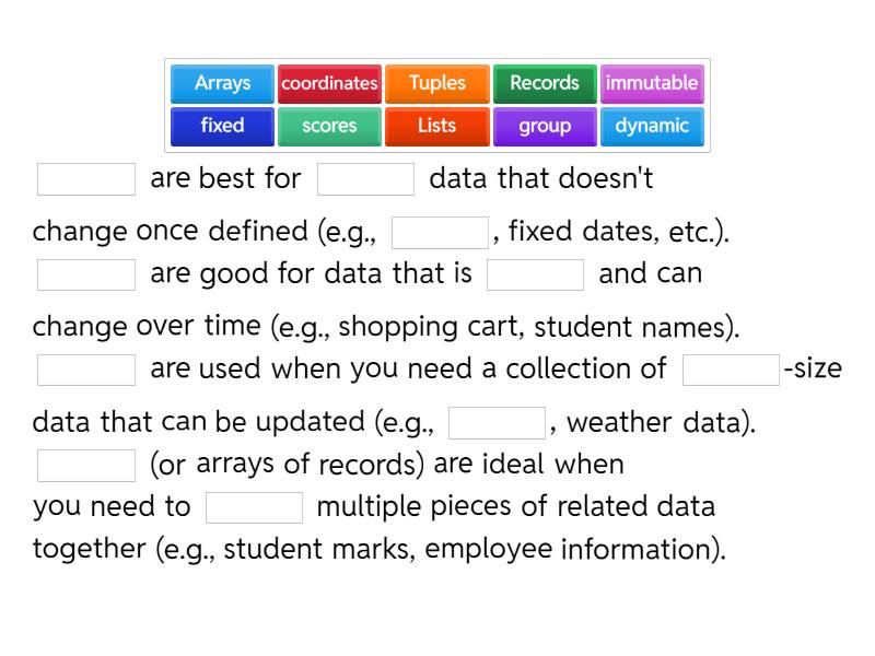 ____ are best for ____ data that doesn't change once defined (e.g., ____, fixed dates, etc.). ____ are good for data that is ____ and can change over time (e.g., shopping cart, student names). ____ are used when you need a collection of ____-size data that can be updated (e.g., ____, weather data). ____ (or arrays of records) are ideal when you need to ____ multiple pieces of related data together (e.g., student marks, employee information).