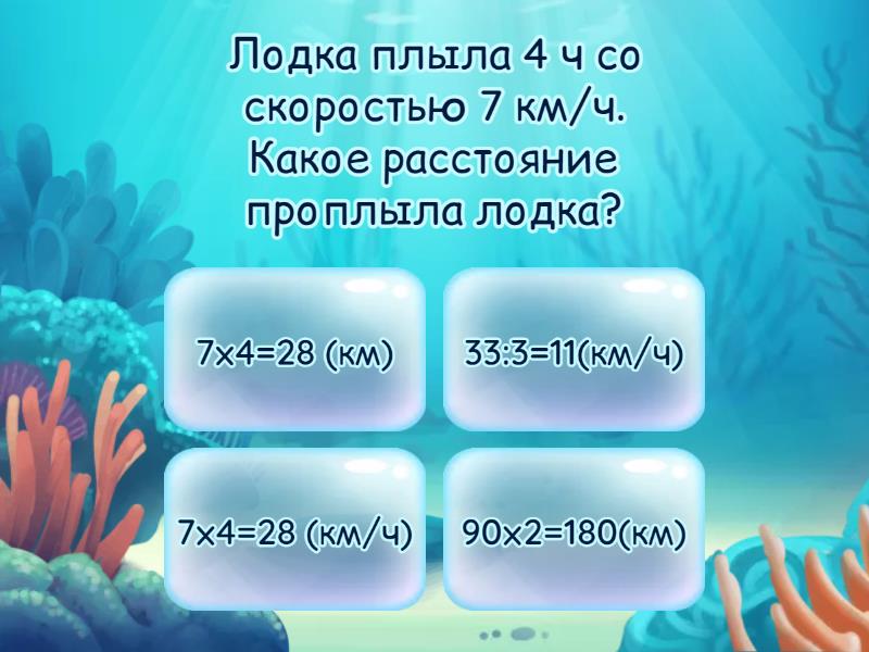 1) Лодка плыла 4 ч со скоростью 7 км/ч. Какое расстояние проплыла лодка? a) 7х4=28 (км) b) 33:3=11(км/ч) c) 7х4=28 (км/ч) d) 90х2=180(км) 2) Мотоциклист ехал по загородному шоссе 5 ч со скоростью 40 км/ч. Какое расстояние проехал мотоциклист? a) 40:5=8(км) b) 40х5=200(км/ч) c) 90х2=180(км) d) 40х5=200(км) 3) Лыжник со скоростью 8 км/ч прошёл дистанцию 24 км. За сколько времени лыжник прошёл эту дистанцию? a) 200х2=400(км) b) 24х8=192(км) c) 7х4=28 (км) d) 24:8=3(ч) 4) Катер за 3 ч проплыл 96 км. С какой скоростью плыл катер? a) 96:3=32(км/ч) b) 96:3=32(км) c) 90х7=630(км) d) 7х4=28 (км) 5) Мальчик бежал 30 м со скоростью 2 м/с. Сколько времени он затратил на этот путь? a) 30:2=15(сек.) b) 30х2=60(км/ч) c) 33:3=11(км/ч) d) 30:2=15(мин) 6) Какое расстояние пешеход пройдёт за 3 ч, идя со скоростью 6 км/ч? a) 6:3=2(км) b) 6х3=18(км) c) 6х3=18(ч) d) 90х7=630(км) 7) Вертолёт летел 2 ч со скоростью 200 км/ч. Какое расстояние пролетел вертолёт? a) 200х2=400(км) b) 40х5=200(км) c) 500х2=1000(км) d) 200:2=100(км/ч) 8) Туристы за 5 ч проплыли на лодке 60 км. С какой скоростью плыли туристы? a) 24:8=3(ч) b) 60:5=12(км/ч) c) 60х5=300(км) d) 60:5=12(км) 9) Скорый поезд ехал 7 ч со скоростью 90 км/ч. Какое расстояние проехал поезд? a) 90:7= ...(км/ч) b) 30:2=15(сек.) c) 90х7=630(км/ч) d) 90х7=630(км) 10) За какое время поезд пройдёт 210 км, если он будет идти со скоростью 70 км/ч? a) 210:70=30(ч) b) 33:3=11(км/ч) c) 210:70=3(км) d) 210:70=3(ч) 11) Самолёт летел 2 часа со скоростью 500 км/ч. Какое расстояние он пролетит? a) 500х2=1000(км) b) 200х2=400(км) c) 500х2=1000(км/ч) d) 500:2=250(ч) 12) За какое время пешеход пройдёт 20 км, идя со скоростью 5 км/ч? a) 20:5=4(ч) b) 20х5=100(км) c) 20:5=4(км) d) 20х5=100(км/ч) 13) Автобус ехал 4 часа со скоростью 80 км/ч. Какое расстояние он проехал? a) 80х4=320(км) b) 80:4=20(км) c) 80х4=320(км/ч) d) 40х5=200(км) 14) Спасаясь от собаки, кошка вскарабкалась на дерево со скоростью 2 м/с за 3 секунды. На какую высоту забралась кошка? a) 2х3=6(м) b) 2х3=6(сек) c) 20:5=4(ч) d) 6:2=3(м) 15) Туристы прошли 60 км, двигаясь со скоростью 12 км/ч. Сколько времени они были в пути? a) 60:12=4(ч) b) 24:8=3(ч) c) 60:12=5(ч) d) 60:12=5(км/ч) 16) С какой скоростью должен ехать велоси педист, чтобы за 3 часа проехать 33 км? a) 33х3=99(км) b) 33х3=66 (км) c) 24:8=3(ч) d) 33:3=11(км/ч) 17) Почтовый голубь летел 2 часа со скоростью 90 км/ч. Какое расстояние он пролетел? a) 90х2=180(км) b) 90х2=180(км/ч) c) 90:2=45(км/ч) d) 33:3=11(км/ч) 18) Плот проплыл по течению реки 18 км за 6 часов. Какова скорость течения реки? a) 18х6=108(км) b) 18:6=3(ч) c) 90х7=630(км) d) 18:6=3(км/ч) 19) Расстояние между городами 366 км поезд прошёл за 6 часов. Чему равна скорость поезда? a) 18:6=3(км/ч) b) 366:6=63(км/ч) c) 366:6=93(км/ч) d) 366:6=61(км/ч) 20) За какое время самолёт пролетит 1200 км, если его скорость 300 км/ч? a) 1200:300=40(ч) b) 1200:300=4(ч) c) 1200:300=4(км/ч) d) 366:6=61(км/ч)
