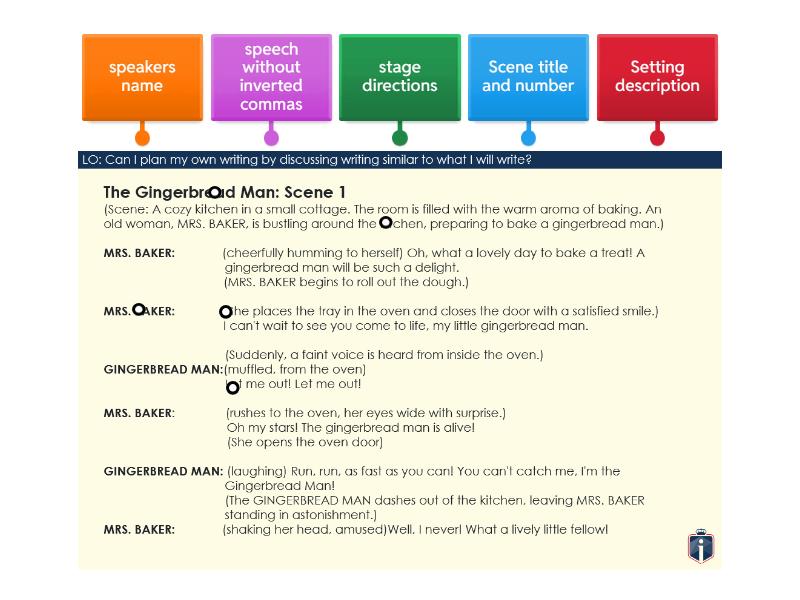 Scene title and number, Setting description, speakers name, stage directions, speech without inverted commas.
