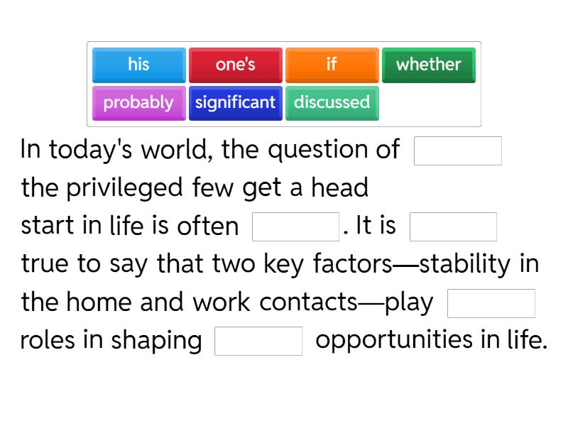 In today's world, the question of ____ the privileged few get a head start in life is often ____. It is ____ true to say that two key factors—stability in the home and work contacts—play ____ roles in shaping ____ opportunities in life. No one would dispute ____ stability in the home provides a solid foundation for success. Children raised in a secure environment are ____ to perform well ____, develop strong social skills, and have a positive outlook on life. This stability allows them to focus on their education and personal growth without the constant worry of external hardships. ____, such an environment often offers the emotional and financial support needed to pursue higher education or other opportunities that can lead ____ success. It is often ____ that work contacts and opportunities also give some individuals a ____ advantage. People born into families with established networks are ____ to have access to job opportunities or internships that others might never hear about. ____, these contacts can serve as mentors, guiding individuals through the professional world. Such connections, which can sometimes feel like a shortcut, ____ provide an edge that is difficult for others to replicate. ____, ____ both factors are important, ____ stability in the home is more relevant. ____, even with work contacts, a lack of a solid foundation can hinder one's ability to make the most of those opportunities. ____, a stable home environment can foster the resilience and skills needed to navigate the professional world. Despite that, work contacts can certainly provide a useful boost, but they cannot replace the fundamental advantages that stability offers.