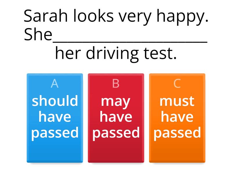 1) Sarah looks very happy. She_____________________ her driving test. a) should have passed b) may have passed c) must have passed 2) Jim hasn't arrived yet. He ___________________ the wrong train. a) may have taken b) should have taken c) can't have taken 3) You __________________ ill yesterday. I saw you at Juliet's party. a) must have been b) could have been c) can't have been 4) I didn't pass my driving test. I__________________more. a) could have practices b) must have practiced c) should have practiced 5) I __________________ a teacher, but I decided to become a lawyer. And, I'm happy with my choice. a) should have been b) could have been c) must have been 6) You _______________________ to my party, it was awesome. We missed you. a) should have come b) could have come c) may have come 7) Nick __________________________ his job because his staff is in his office. a) may not have left b) shouldn't have left c) can't have left 8) I'm sorry to come without calling. I ________________________ you a message. a) could have sent b) should have sent c) can't have sent 9) Lucy didn't come to work today. She__________________ ill. a) may have been b) can't have been c) should have been 10) They _____________ got in through the window - it's on the 21st floor! a) should have b) could have c) might not have d) can't have e) must have 11) I explained it but she _________ misunderstood - my Japanese isn’t very good. a) could have b) can't have c) shouldn't have d) must have 12) You ________ seen her. She was standing right next to you. a) can't have b) must have c) might have d) shouldn't have