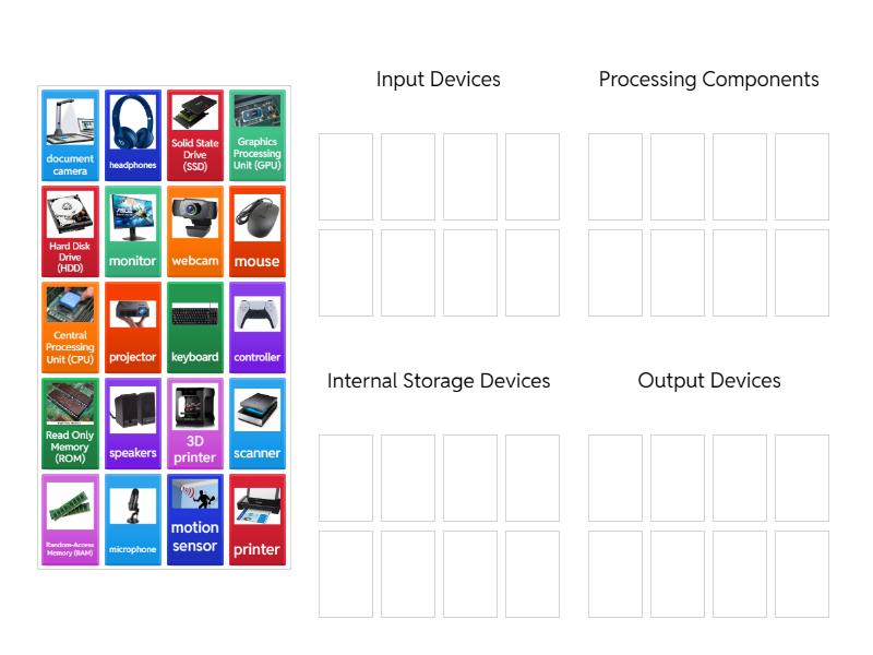 Input Devices: keyboard, mouse, microphone, controller, scanner, document camera, webcam, motion sensor, Processing Components: Central Processing Unit (CPU), Graphics Processing Unit (GPU), Internal Storage Devices: Random-Access Memory (RAM), Read Only Memory (ROM), Hard Disk Drive (HDD), Solid State Drive (SSD), Output Devices: 3D printer, printer, monitor, headphones, projector, speakers,