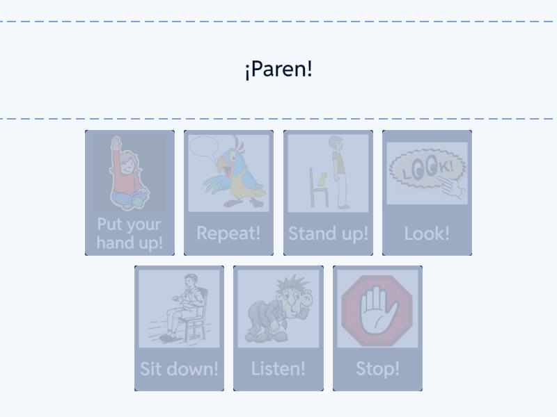 Stop! - ¡Paren!, Look! - ¡Miren!, Listen! - ¡Escuchen!, Repeat! - ¡Repitan!, Sit down! - ¡Siéntense!, Stand up!  - ¡Levántense!, Put your hand up! - ¡Levanta la mano!,