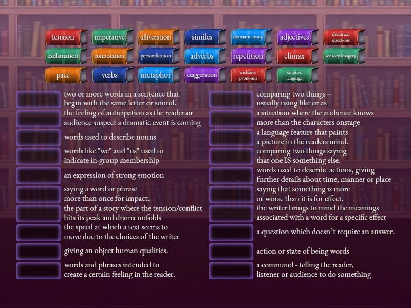 verbs - action or state of being words, adjectives - words used to describe nouns, adverbs - words used to describe actions, giving further details about time, manner or place, alliteration - two or more words in a sentence that begin with the same letter or sound., metaphor - comparing two things saying that one IS something else., personification - giving an object human qualities., sensory imagery - a language feature that paints a picture in the readers mind., rhetorical questions - a question which doesn’t require an answer., repetition - saying a word or phrase more than once for impact., exaggeration - saying that something is more or worse than it is for effect., emotive language - words and phrases intended to create a certain feeling in the reader., similes - comparing two things – usually using like or as, exclamation - an expression of strong emotion, connotation - the writer brings to mind the meanings associated with a word for a specific effect, imperative - a command - telling the reader, listener or audience to do something, inclusive pronouns - words like "we" and "us" used to indicate in-group membership, dramatic irony - a situation where the audience knows more than the characters onstage, pace - the speed at which a text seems to move due to the choices of the writer, tension - the feeling of anticipation as the reader or audience suspect a dramatic event is coming, climax - the part of a story where the tension/conflict hits its peak and drama unfolds,