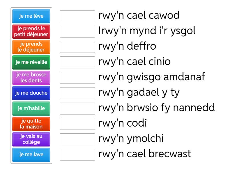 je me réveille - rwy'n deffro, je me lève - rwy'n codi, je prends le petit déjeuner - rwy'n cael brecwast, je me lave - rwy'n ymolchi, je me douche - rwy'n cael cawod, je me brosse les dents - rwy'n brwsio fy nannedd, je m'habille - rwy'n gwisgo amdanaf, je quitte la maison - rwy'n gadael y ty, je vais au collège - Irwy'n mynd i'r ysgol, je prends le déjeuner - rwy'n cael cinio,