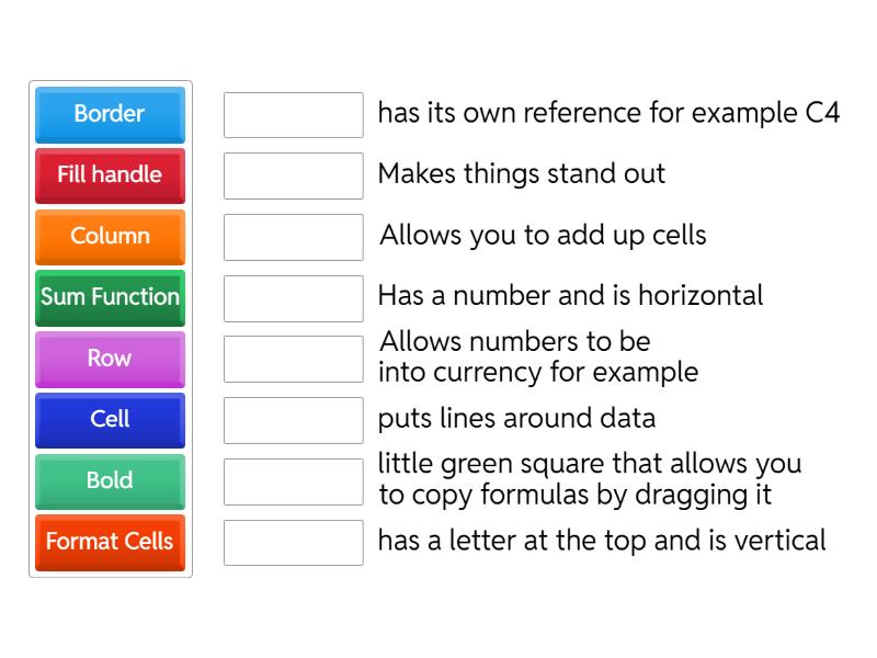 Sum Function - Allows you to add up cells, Border - puts lines around data, Bold - Makes things stand out, Fill handle - little green square that allows you to copy formulas by dragging it, Column - has a letter at the top and is vertical, Row - Has a number and is horizontal, Cell - has its own reference for example C4, Format Cells - Allows numbers to be into currency for example,