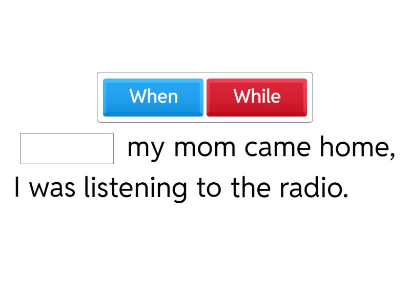 ____ my mom came home, I was listening to the radio. They opened the door ____ I was reading the magazine. ____ she was crying, her dad was talking on the phone. You were baking a cake ____ she was reading a magazine. The phone rang ____ dad was taking a bath. Dad was taking a bath ____ the phone rang. He caught a ball ____ he was playing with his friends. The students stood up ____ the teacher came in. I was playing the piano ____ my mom came into the room. I was playing the piano when my mom ____ into the room. While she ____, her dad was talking on the phone. They opened the door while I ____ the magazine. Dad was taking a bath when the phone ____. The phone rang while dad ____ a bath. He caught a ball while he ____ with his friends. When my mom ____ home, I was listening to the radio. You were baking a cake while she ____ a magazine. I was ____ TV when my dad ____ home. I ____ you while I ____ ____ my dog. While I ____ ____ a horror movie, my brother was ____ a bath. I was playing the piano ____ my mom came into the room. ____ I was playing the piano, my mom came into the room. ____ you ____ to the movies this Sunday? My friend will ____ ____ next Sunday. Yes, Mandy and I ____ go to the beach ____. She likes to read a ____ in bed every night. While he was ____ a model, his sister was ____. While I was ____ on a shirt, mom was making sandwiches. I ____ a message on the desk an hour ago. They will go ____ along the river next month. Sharon has a new bike. She'll go ____ tomorrow. We'll go ____ near a lake this weekend.