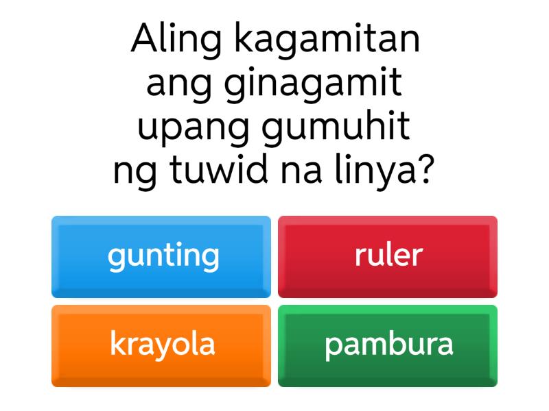 1) Aling kagamitan ang ginagamit upang gumuhit ng tuwid na linya? a) gunting b) ruler c) krayola d) pambura 2) Dito inilalapat ang drawing paper.Dito inilalapat ang drawing paper. Ito ay yari sa kahoy na karaniwang may sukat na 16x24 pulgada. a) ruler b) potractor c) drawing board d) gunting 3) Ito ang panguhaning materyales upang makagawa ng drowing. a) lapis b) pambura c) ruler d) triangle 4) Ito ay pandikit na gawa sa papel. a) lapis b) ruler c) masking tape d) pambura 5) Ito ay ginagamit upang mabura ang mga hindi nais na guhit ng lapis. a) ruler b) pambura c) lapis d) potractor
