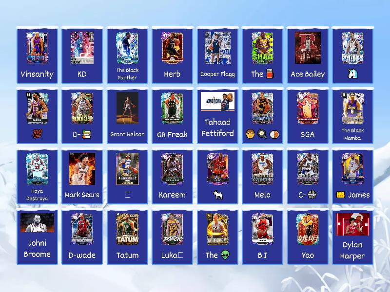 Luka🪄, 🧑🍳🍛, Tatum , 🐐, Herb, Vinsanity , 🦄, Melo, 👑 James, The ⛽️, Yao, 💯, Kareem , 🪄, KD, The 👽, The Black Mamba , B.I, The Black Panther , Hoya Destroya, 🇬🇷 Freak, C-🕸️, D-wade , SGA, D-📚, Mark Sears, Grant Nelson, Cooper Flagg, Ace Bailey, Dylan Harper , Johni Broome , Tahaad Pettiford ,
