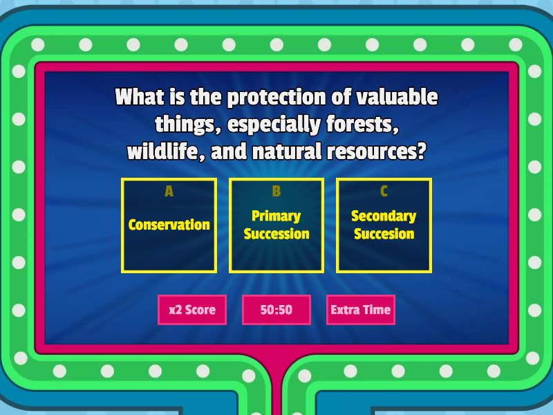 1) What is the protection of valuable things, especially forests, wildlife, and natural resources? a) Conservation b) Primary Succession c) Secondary Succesion 2) What is the change that occurs where an ecosystem already existed? a) Conservation b) Primary Succession c) Secondary Succession 3) What is the change that occurs to create a new ecosystem where one did not exist before? a) Conservation b) Primary Succession c) Secondary Succesion 4) Which of the following is a way humans damage ecosystems? a) Sleep b) Pollution c) Breathing 5) Which of the following is NOT considered a natural disaster a) Fire b) Snow c) Storms d) All of these are natural disasters