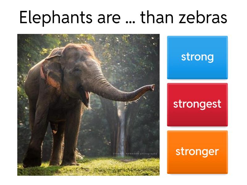 1) Elephants are ... than zebras a) strong b) strongest c) stronger 2) Vicky is the ... girl in my class a) prettyest b) prettiest c) prettier d) prettyer 3) The giraffe is ... animal. a) taller b) tallest c) the tallest 4) Snakes are ... than mice a) long b) longer c) longest d) longger e) longgest 5) Tag is the ... singer of all friends a) good b) better c) goodest d) best e) gooder 6) Hippos are ... than foxes a) fat b) fatest c) fatter d) fater e) fattest 7) I want the ... apple on the table! a) bigest b) biger c) big d) biggest e) bigger 8) This is the ... toy shop in the city a) newer b) new c) newest 9) Cats are ... than dogs a) lazy b) lazier c) lazyest d) lazyer e) laziest 10) I am the ... girl in my class a) most smarter b) smarter c) smart d) smartest