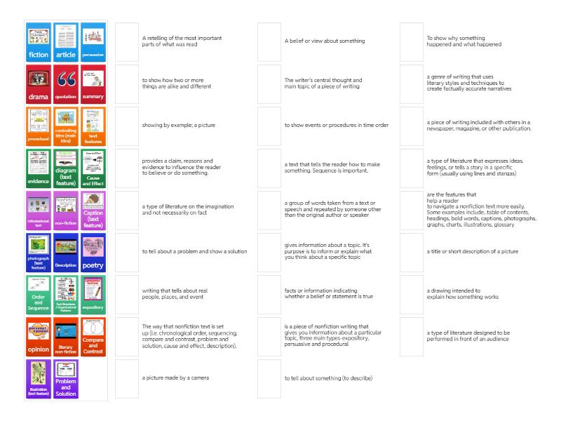 non-fiction - writing that tells about real people, places, and event, fiction - a type of literature on the imagination and not necessarily on fact, poetry - a type of literature that expresses ideas, feelings, or tells a story in a specific form (usually using lines and stanzas), drama - a type of literature designed to be performed in front of an audience, literary non-fiction - a genre of writing that uses literary styles and techniques to create factually accurate narratives, informational text - is a piece of nonfiction writing that gives you information about a particular topic, three main types-expository, persuasive and procedural, expository - gives information about a topic. It's purpose is to inform or explain what you think about a specific topic, persuasive - provides a claim, reasons and evidence to influence the reader to believe or do something., procedural - a text that tells the reader how to make something. Sequence is important., controlling idea (main idea) - The writer's central thought and main topic of a piece of writing, article - a piece of writing included with others in a newspaper, magazine, or other publication., Text Structures / Organizational Patterns - The way that nonfiction text is set up (i.e. chronological order, sequencing, compare and contrast, problem and solution, cause and effect, description)., Cause and Effect - To show why something happened and what happened, Description - to tell about something (to describe), Order and Sequence - to show events or procedures in time order, Compare and Contrast - to show how two or more things are alike and different, Problem and Solution - to tell about a problem and show a solution, text features - are the features that help a reader to navigate a nonfiction text more easily. Some examples include...table of contents, headings, bold words, captions, photographs, graphs, charts, illustrations, glossary, diagram (text feature) - a drawing intended to explain how something works, photograph (text feature) - a picture made by a camera, illustration (text feature) - showing by example; a picture, Caption (text feature) - a title or short description of a picture, opinion - A belief or view about something, quotation - a group of words taken from a text or speech and repeated by someone other than the original author or speaker, summary - A retelling of the most important parts of what was read, evidence - facts or information indicating whether a belief or statement is true,